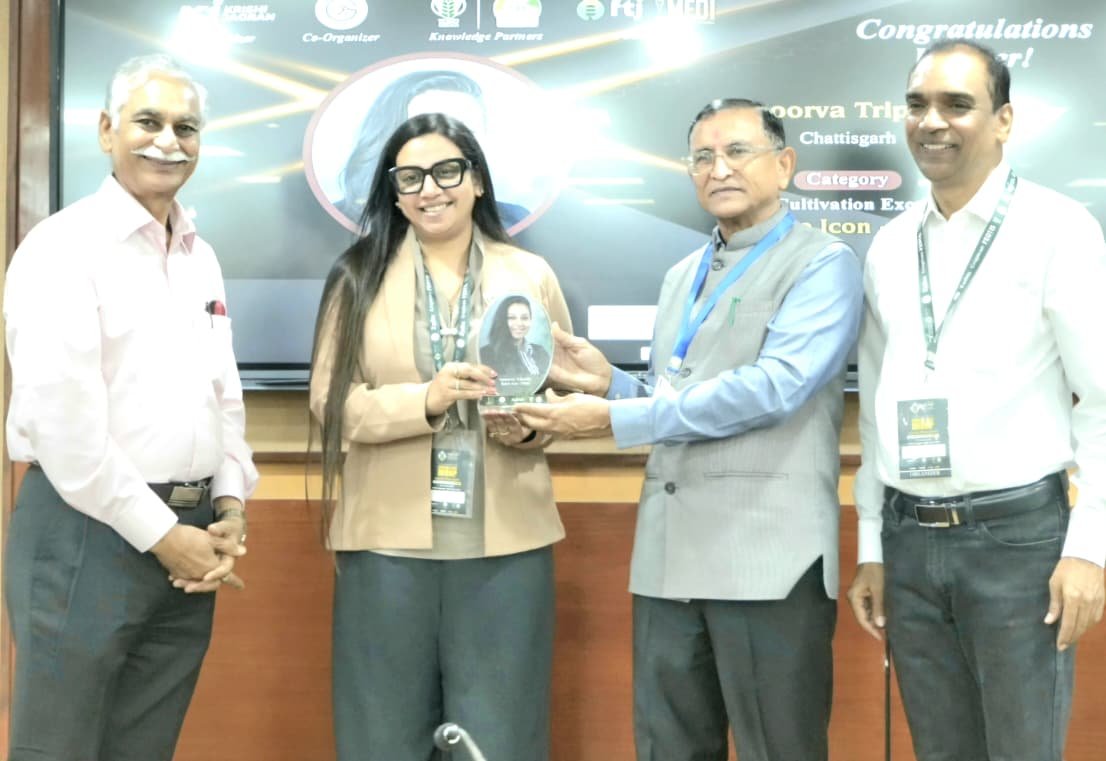 रायपुर 23 अप्रैल।देश की कृषि राजधानी कहे जाने वाले पूसा स्थित आईसीएआर परिसर के एनएएससी कॉम्प्लेक्स में आयोजित भव्य “MIONP 2.0 – मेक इंडिया ऑर्गेनिक, नेचुरल एंड प्रॉफिटेबल” सम्मेलन में बस्तर की बेटी अपूर्वा त्रिपाठी को वर्ष 2026 का प्रतिष्ठित “स्पाइस आइकन” सम्मान प्रदान किया गया। यह उपलब्धि न केवल बस्तर बल्कि पूरे छत्तीसगढ़ के लिए गर्व का विषय बन गई है।